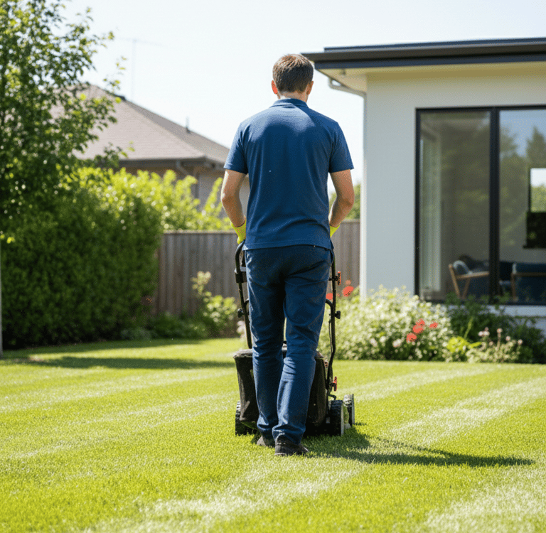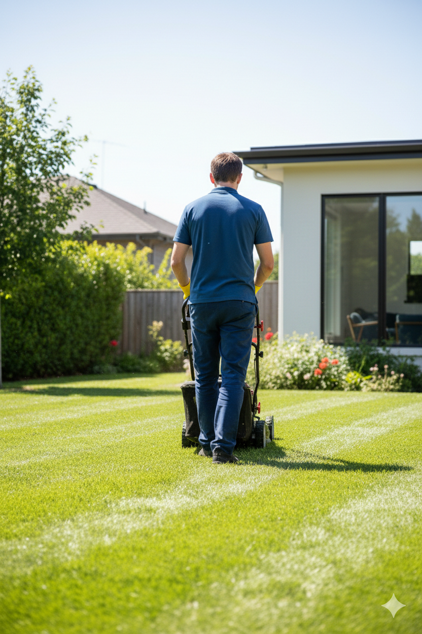 Entretien de pelouse : Tonte régulière pour un gazon net et ramassage des herbes coupées.